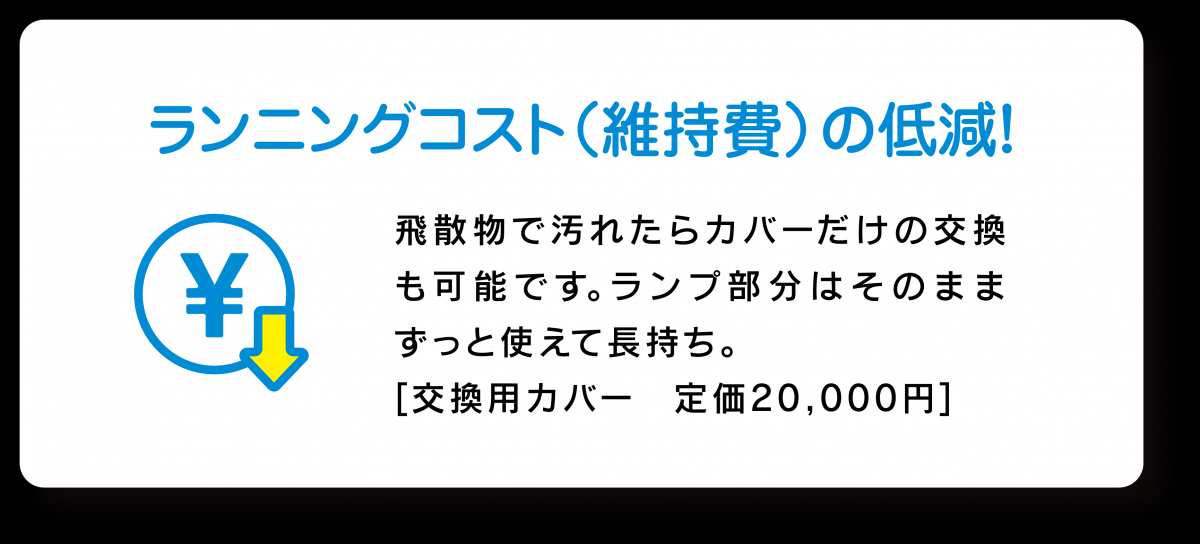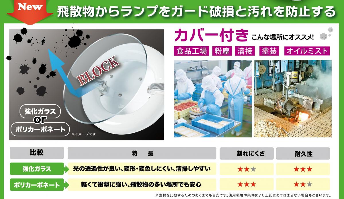 改善ポイントは、従来の樹脂素材から、アルミやステンレスなどに素材を変えることで石油資源の使用を抑え、低炭素社会の実現に寄与します。また、アーム型の取付金具を標準とすることで「投光器」として使用可能になりました。さらに、カバー付きオプションも登場!食品工場、粉塵、溶接、塗装、オイルミスト工場にも対応します。